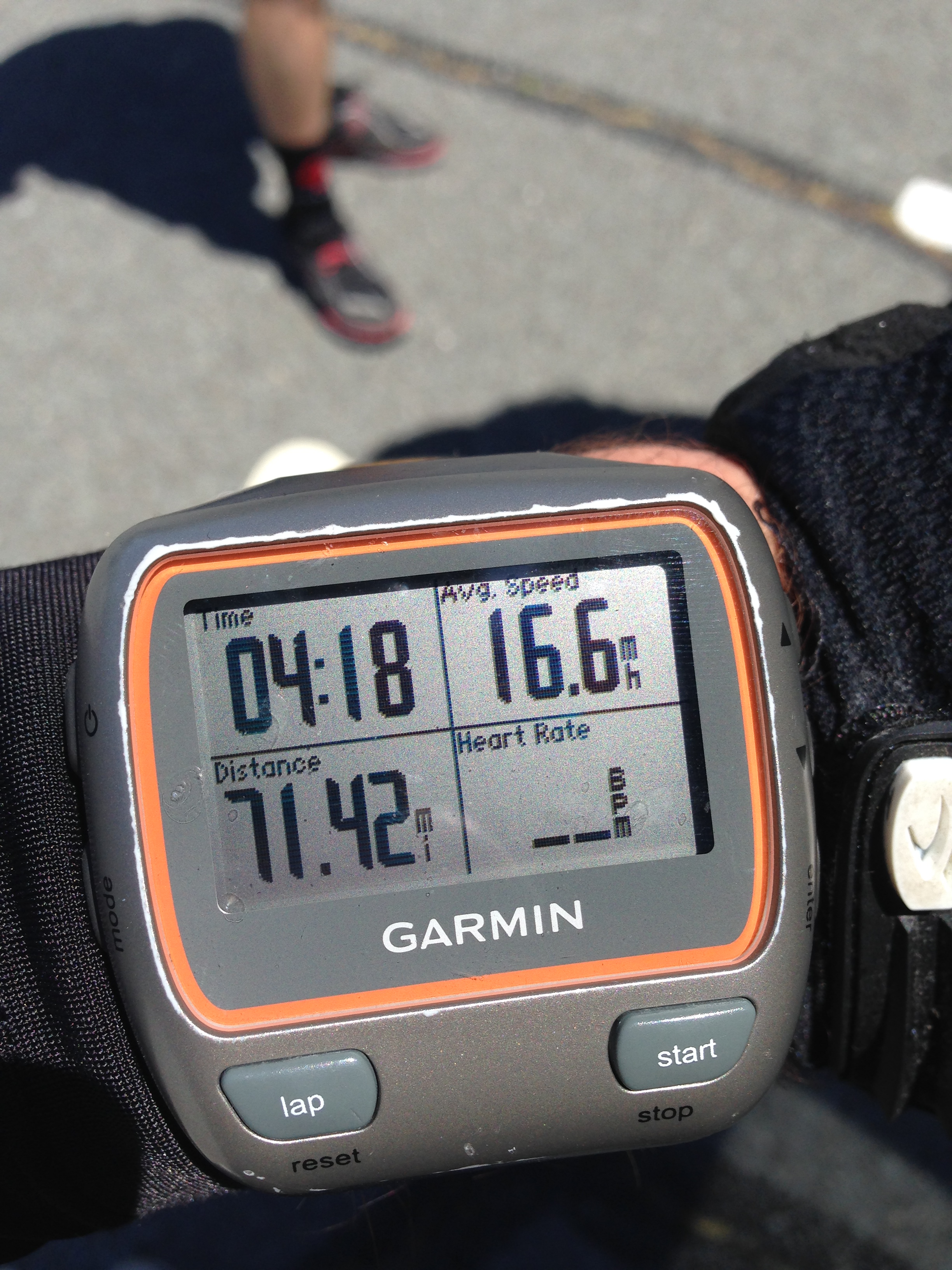 I stuck with my Ironman and Half Ironman nutrition plan – a concentrated blend of Hammer Perpetuem and water that I sipped every ~20 minutes. I washed it down with water – a lot of water, and also ate one Picky Bar per hour – approximately 1200 calories over the 4:20 ride. I felt strong and consistent during the ride, and split the first 36 miles at roughly a 15.7 mph pace. Although this is off what I typically ride, most of the climbs were in the first half and I wanted to conserve for the latter half.