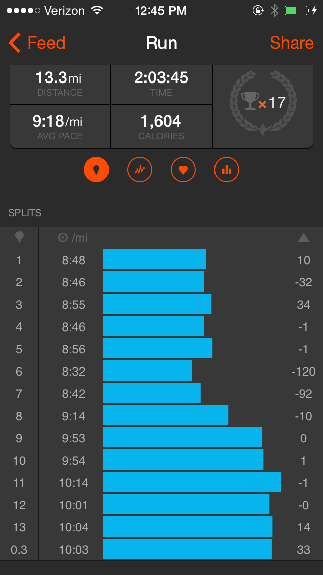 The race was bad for me: my legs felt heavy from the start, and maintaining what should have been a comfortable half marathon pace (8:30 – 8:45) was burdensome and unreasonably difficult. Right before we hit Ocean Beach, I fell apart, suffering from the same knee pain that occurred during North Face and has reared its ugly head during my runs since the 50K. My pace slowed way down (to a 10:14 mile at mile 11), and I painfully shuffled through the out and back along the beach and to the finish line. I finished feeling defeated and in pain; my knee along the outside of my leg was killing me.